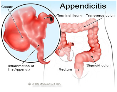 The appendix is a narrow tubular pouch attached to the intestines. When the appendix is blocked, it becomes inflamed and results in a condition termed appendicitis. If the blockage continues, the inflamed tissue becomes infected with bacteria and begins to die from a lack of blood supply, which finally results in the rupture of the appendix (perforated or ruptured appendix).